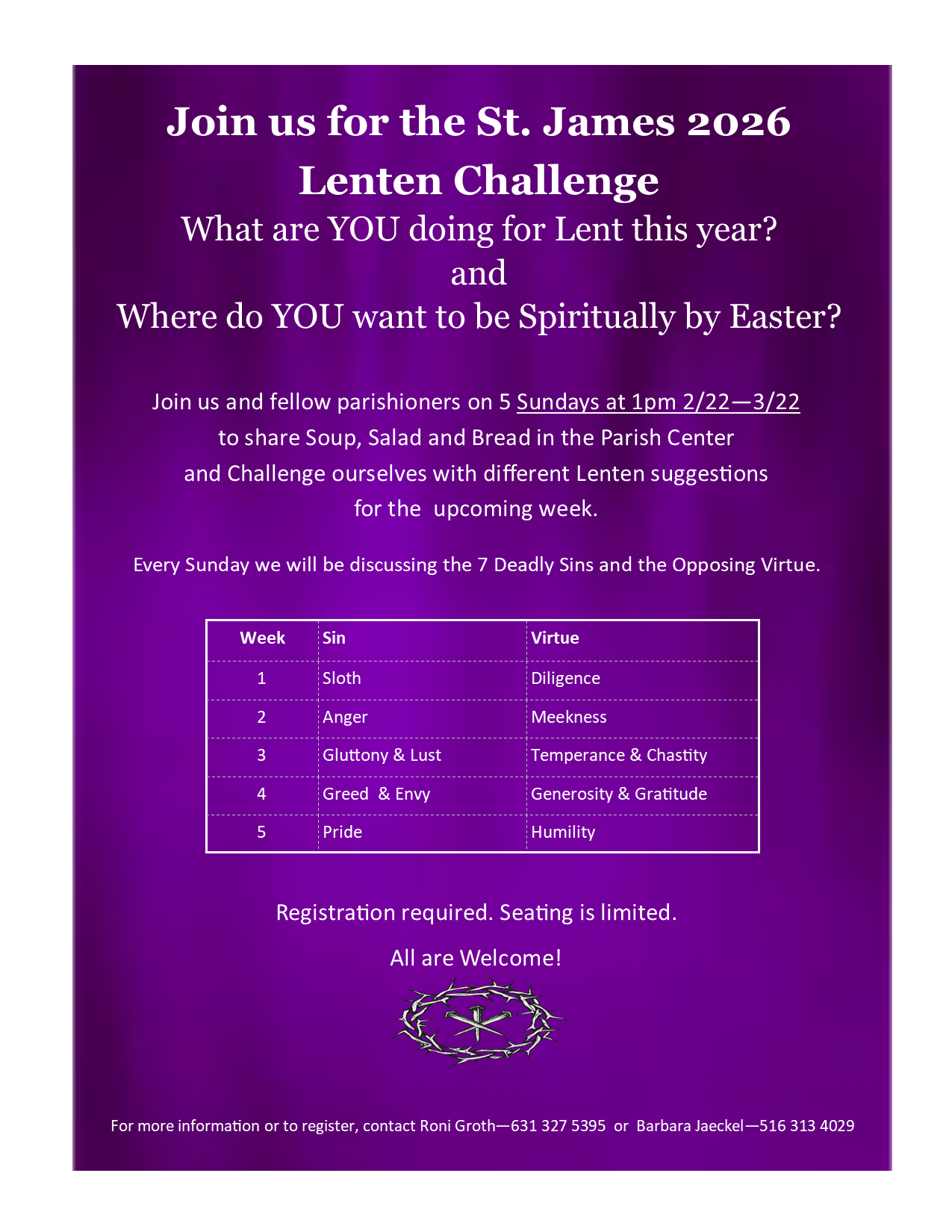 At St. James, our parish bulletins are your go-to source for the latest news, events, and inspiration. Each week, we share important updates, spiritual reflections, and opportunities to connect with our vibrant community. Stay informed and engaged with us!